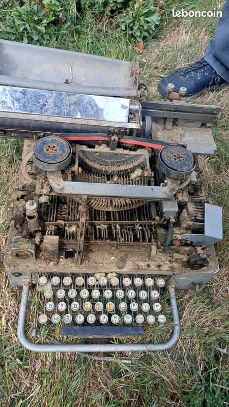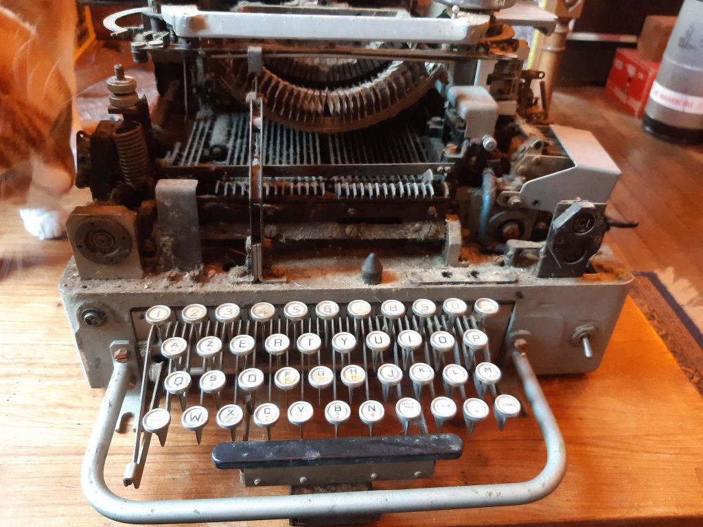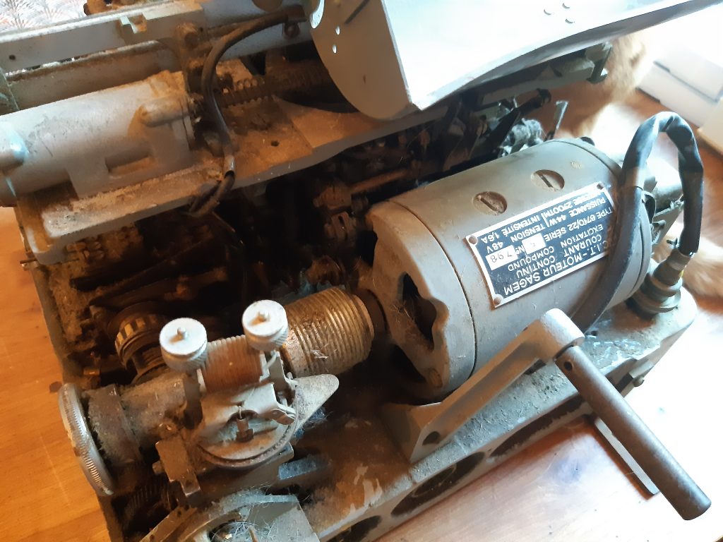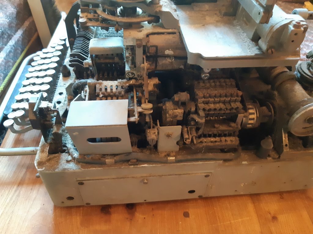 Malgré beaucoup de crasse, il semble complet. Le clavier est sale mais toutes les touches sont présentes et en bon état. Le moteur tourne librement et à l’ohmmètre ses enroulements ne sont pas coupés. L’électroaimant montre lui aussi une résistance nominale. Sur le dessus du chariot quelques pièces sont un peu tordues mais rien bloquant.