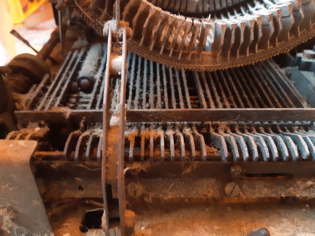 Après avoir imprégné le mécanisme de WD-40 et manipulé un grand nombre de pièces qui étaient collées entre elles j’obtiens des signes de vie en tournant manuellement le mécanisme. J’arrive à le faire « transmettre » un caractère frappé au clavier, et également frapper un marteau en manipulant le relais. Dans les deux cas, pas le caractère désiré, mais c’est un début prometteur !