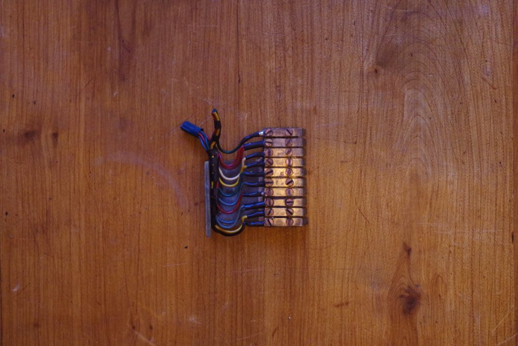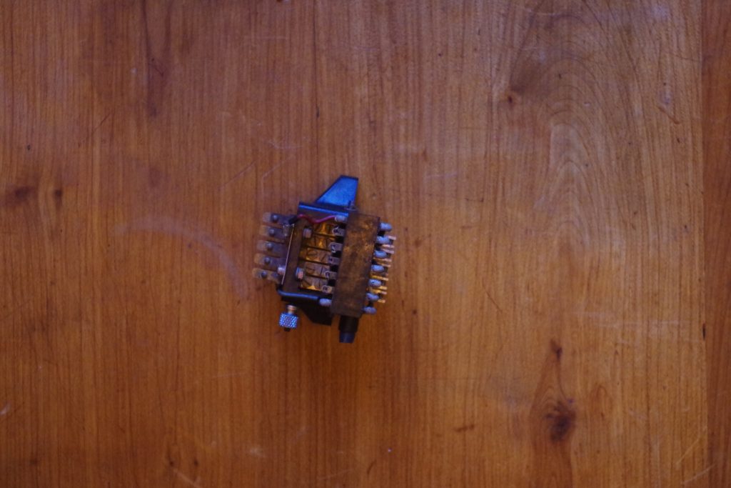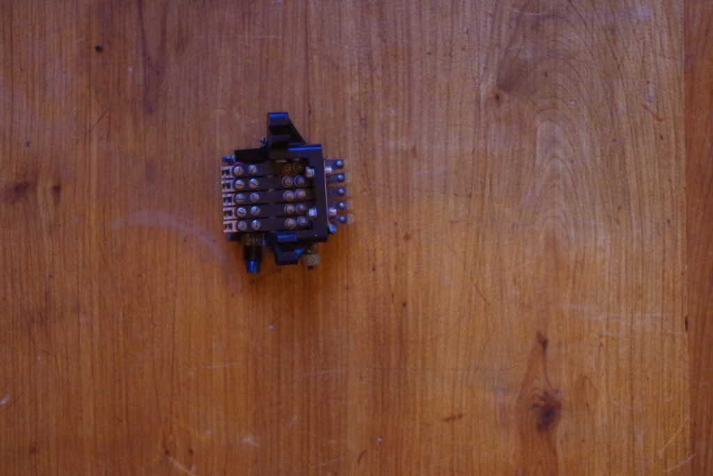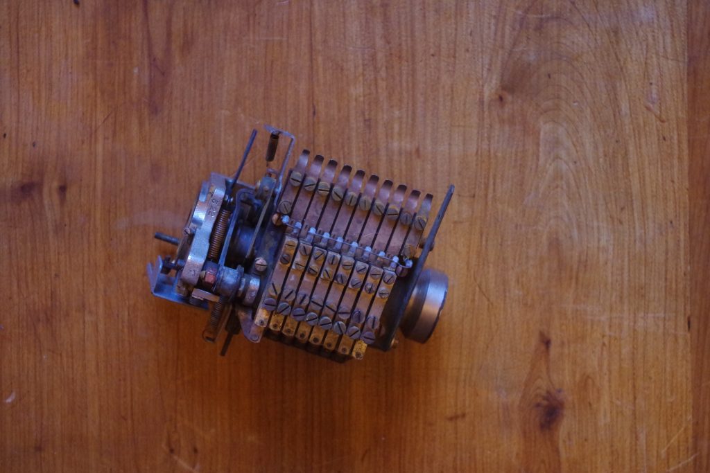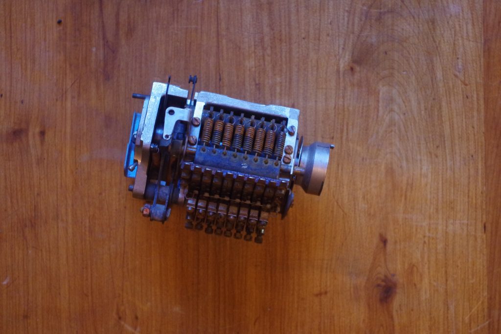 Voyons les différentes pièces extraites en commençant par le mécanisme de sérialisation. On y distingue 10 contacts : deux pour la polarité, un contact emission-réception, 1 pour le bit de start, 5 pour chacun des bits de données, et enfin 1 pour le bit de stop. L’axe interne enclenche les contacts dans l’ordre et chacun pour un temps donné.