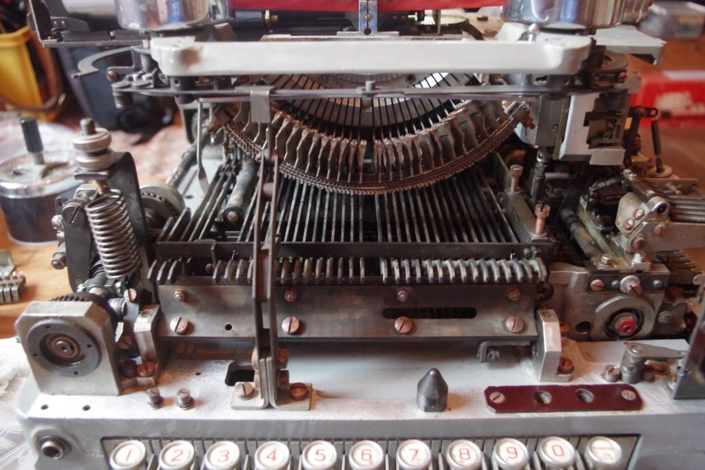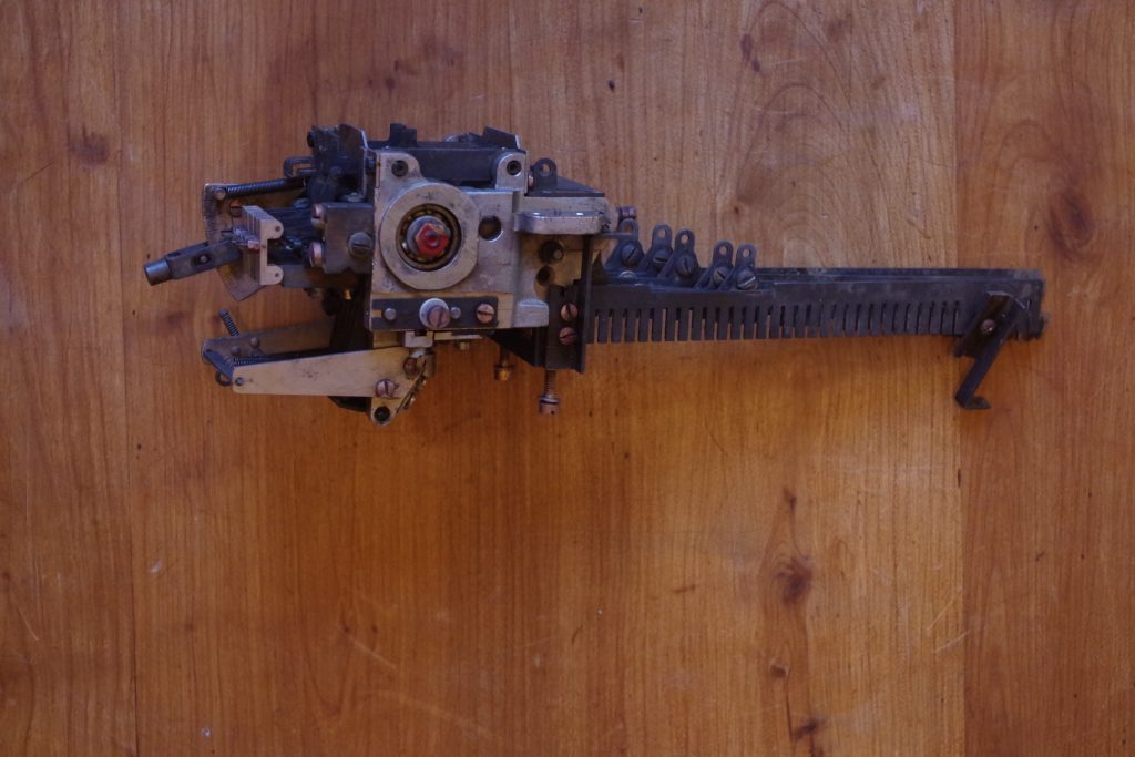 Le bloc d’impression est similaire à de nombreuses machines à écrire. Pour faire simple, lorsqu’un caractère doit être imprimé une tirette enclenche le mouvement du moteur sur le mécanisme d’impression ce qui libère les barres de l’emmagasineur. Elles se placent alors dans la position des taquets de transferts ce qui permet à une et une seule barre d’impression de descendre légèrement. Cette descente lui permet d’être attrapée puis tirée par le levier d’impression situé dessous. Cela provoque le déplacement du marteau jusqu’au papier à travers le ruban encreur, et l’avancement d’un caractère.