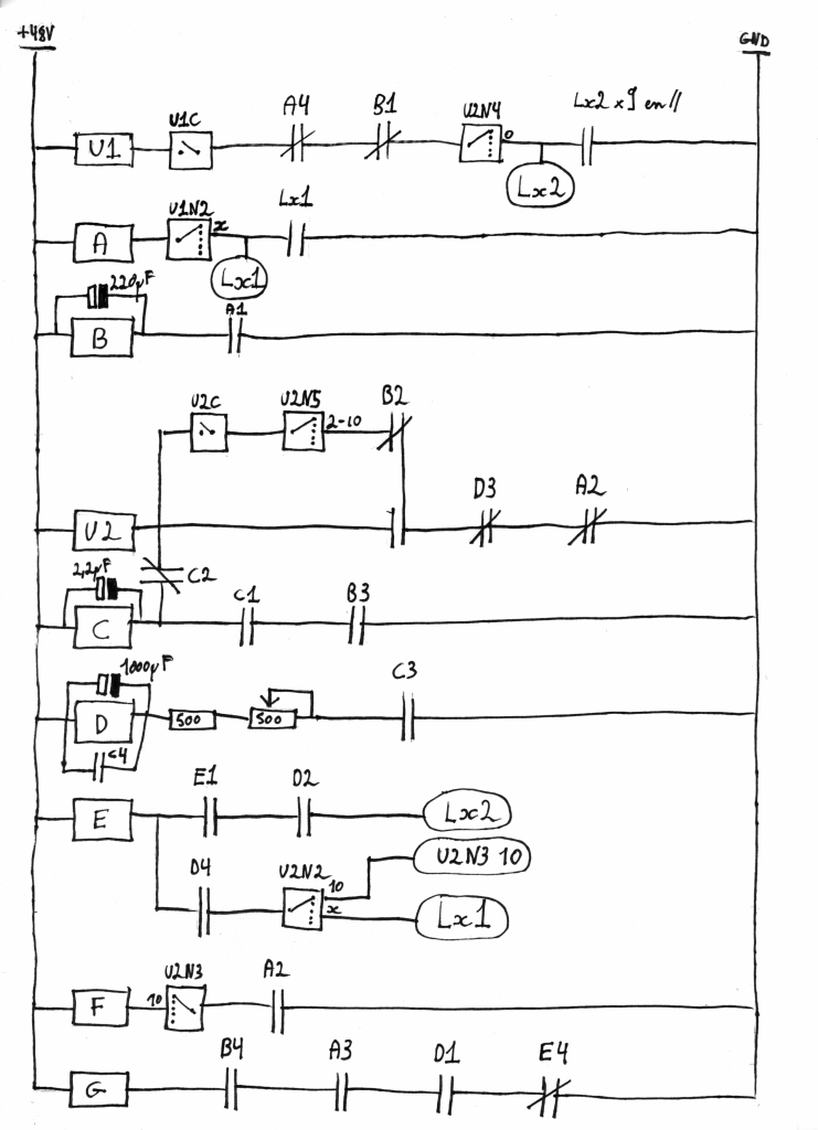 Les 9 relais de ligne Lx sont des 12V à 4 contacts, les 7 autres, A à G, sont 48V à 4 contacts également. Sur le prototype le relais G n’existait pas, le transfo 48V de sonnerie était alimenté en permanence et chauffait. Les condensateurs et résistances ont été choisis au pif en fonction des stocks que j’avais.