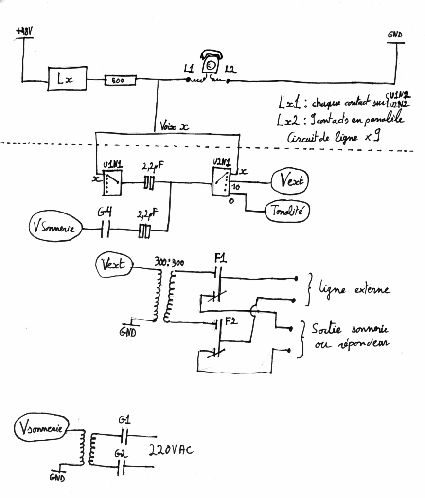 Le relais G active un petit transformateur 48V AC qui sert de générateur de sonnerie, il est très limite tant en tension qu’en puissance et tous les téléphones ne sonnent pas correctement, le problème étant que si on augmente la puissance des sonneries il faudra aussi générer une tonalité sous peine d’abîmer les oreilles des appelants…