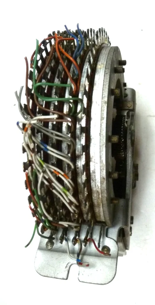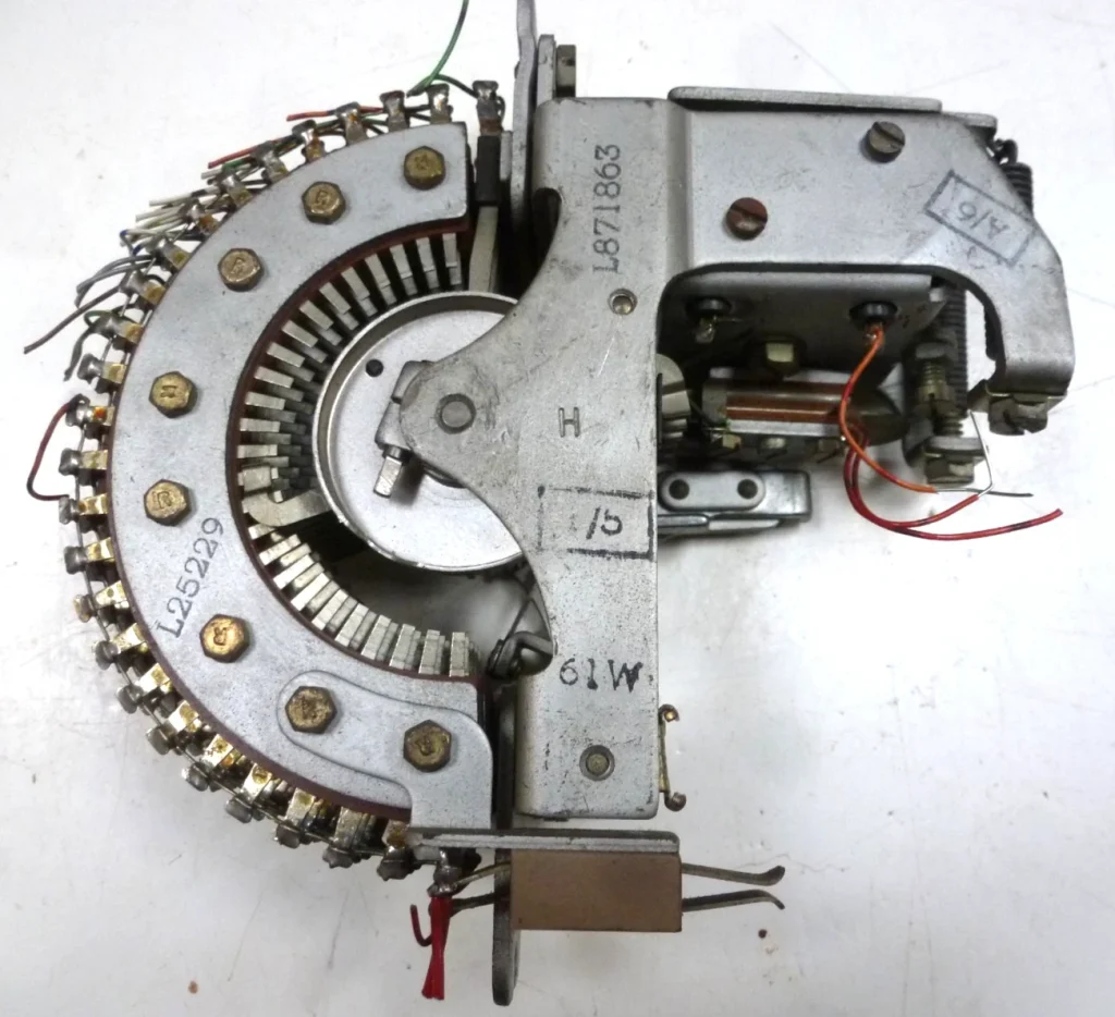 Pour faire simple, en envoyant un train d’impulsions dans la bobine de l’uniselecteur on le fais avancer d’autant de positions que d’impulsions. Il est donc facile de le commander à l’aide d’un cadran téléphonique rotatif.